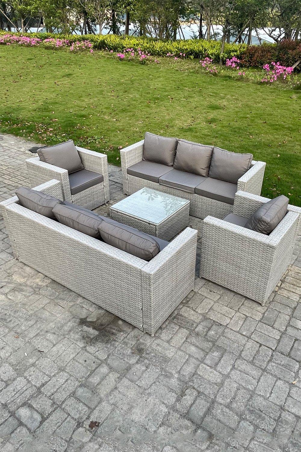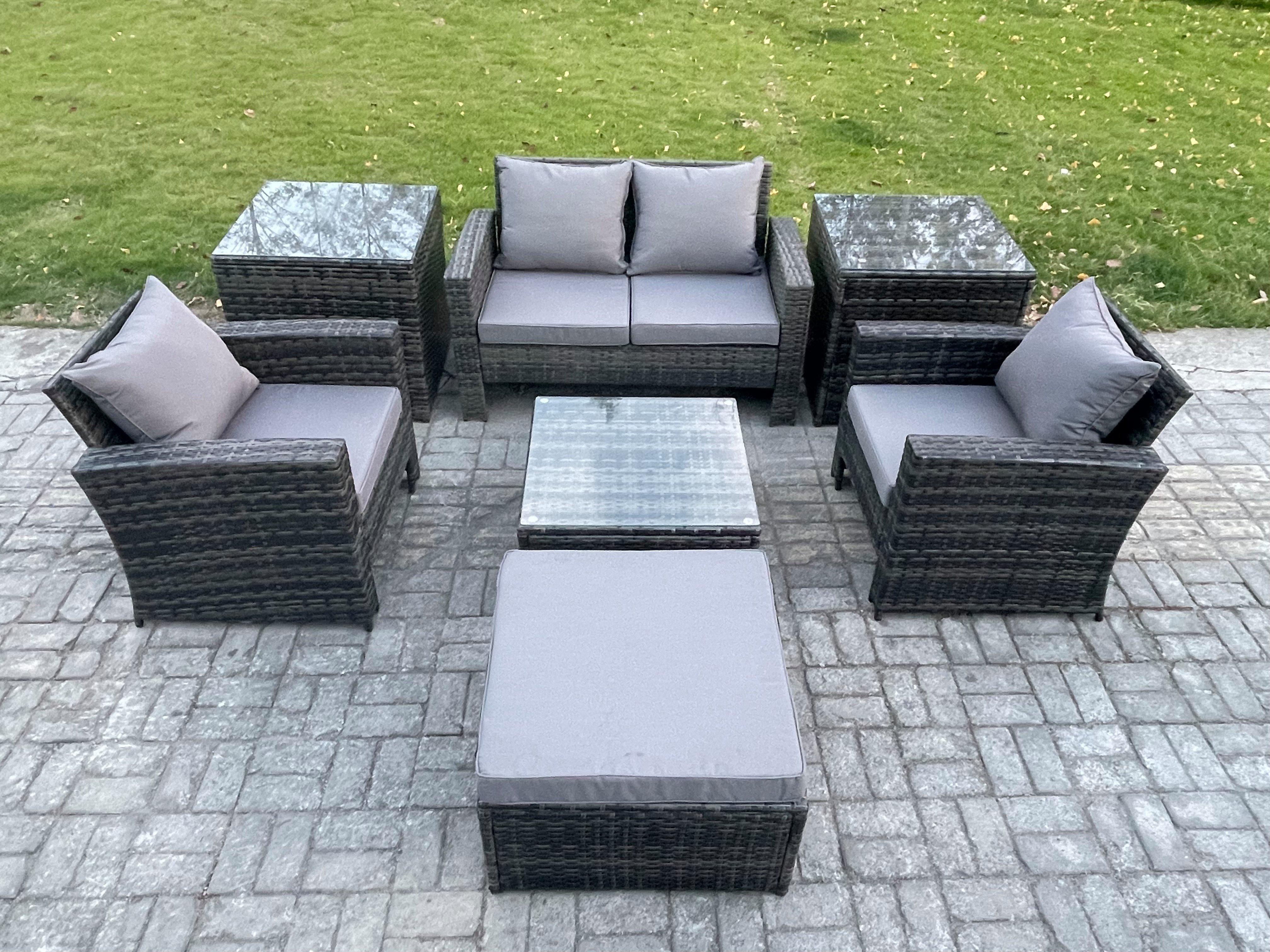 6 Seater Outdoor Garden Furniture High Back Rattan Sofa Set with Square Coffee Table 2 Small Footstools Dark Grey Mixed