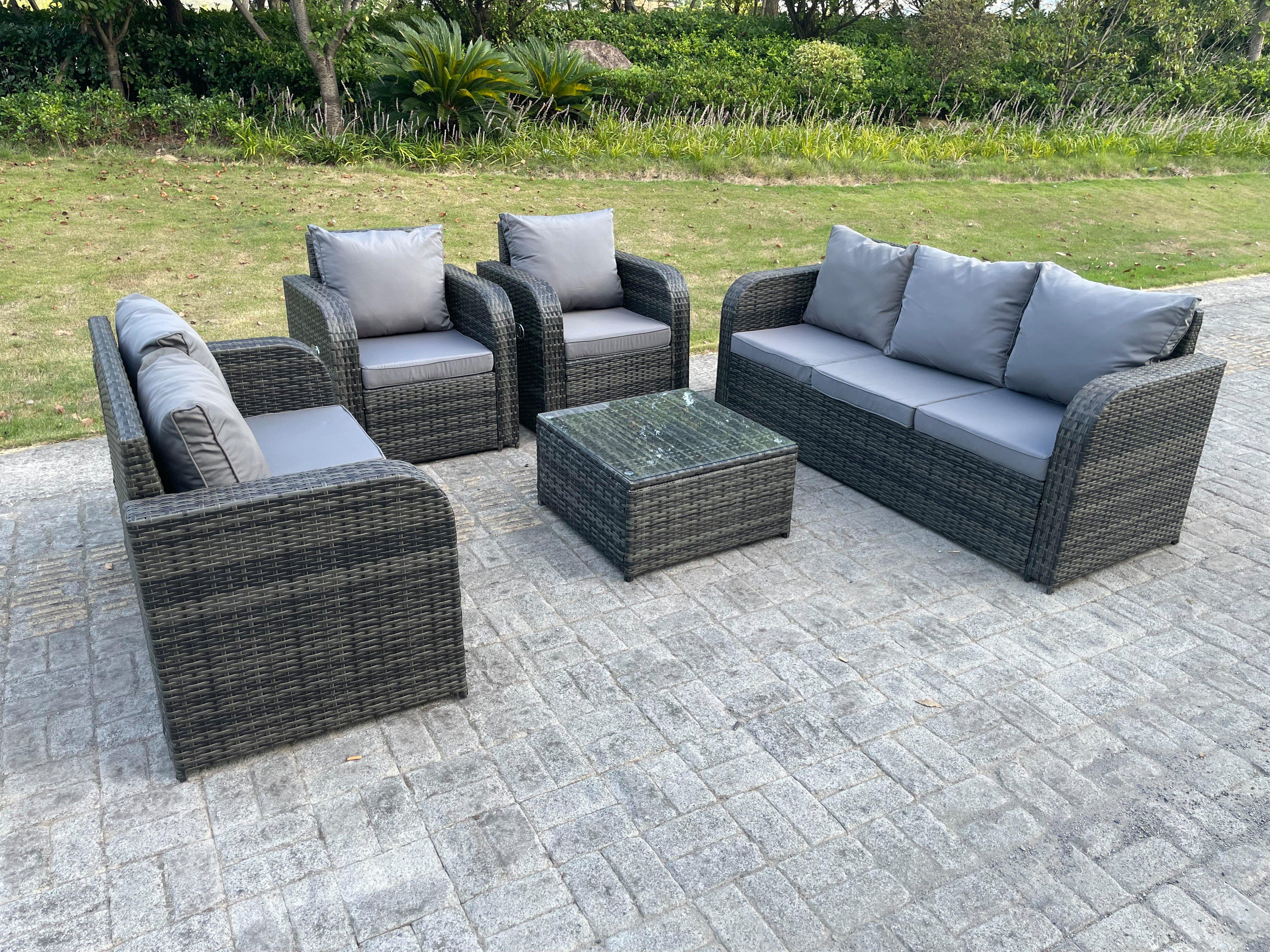5 Seater Outdoor Garden Furniture High Back Rattan Sofa Set with Square Coffee Table Big Footstool Dark Grey Mixed
