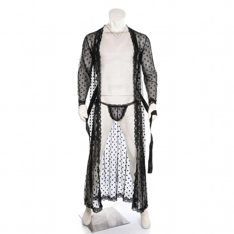 Mens Lace Bathrobe + Thong Sex Clothing Pole Dance Gay Sissy Fetish Open Crotch Underwear See Through Mesh Bodysuit