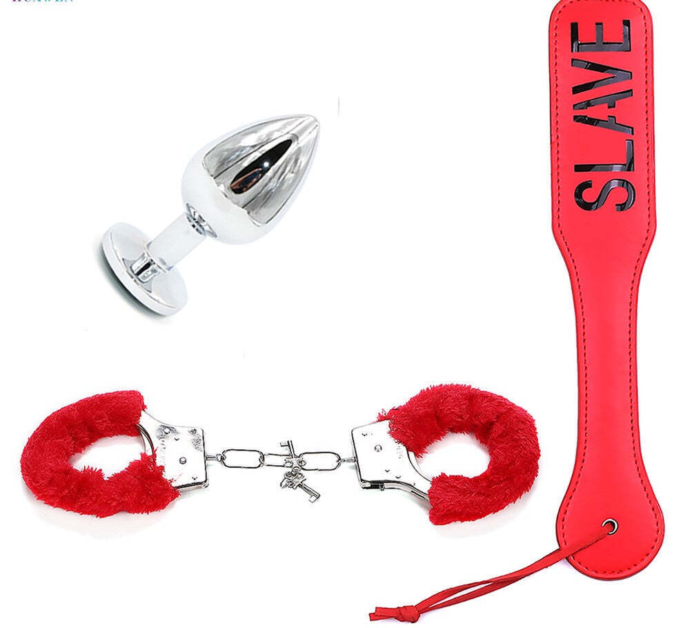 Red Bondage Kit & Butt Plug for Couples Fluffy Hand Cuff Impression Paddle Gift