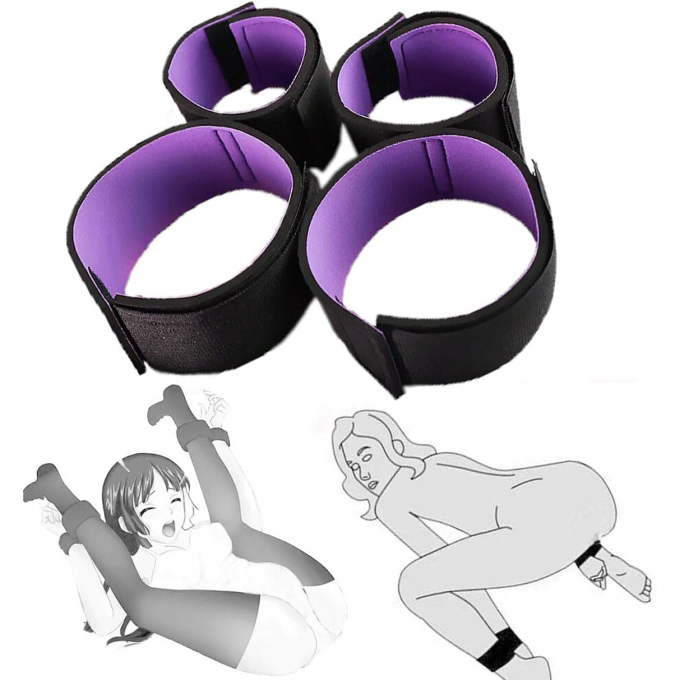 BDSM Sex Bondage Restraints Set with Purple Wrist and Thigh Cuffs, Bed Restraints Kit for Couples and Unisex