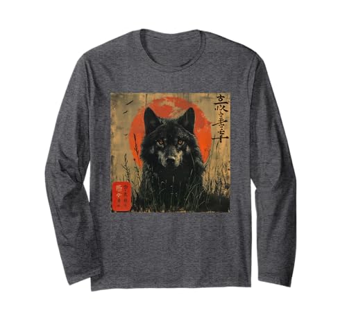 Wolf and Red Sun Japanese Style Dark Forest Art Long Sleeve T-Shirt