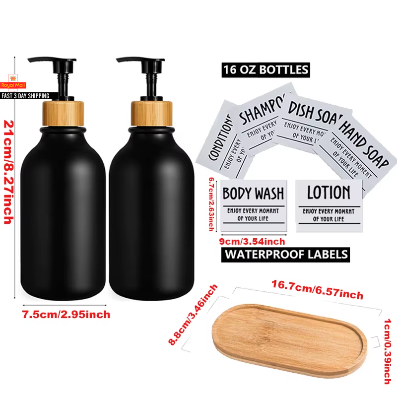 17 oz Shampoo and Conditioner Pump Bottles Soap Dispenser Bamboo Pump Head Empty Glass Refillable Shampoo Conditioner Body Wash Soap Bottles for Bathroom, 3 Pack, Black