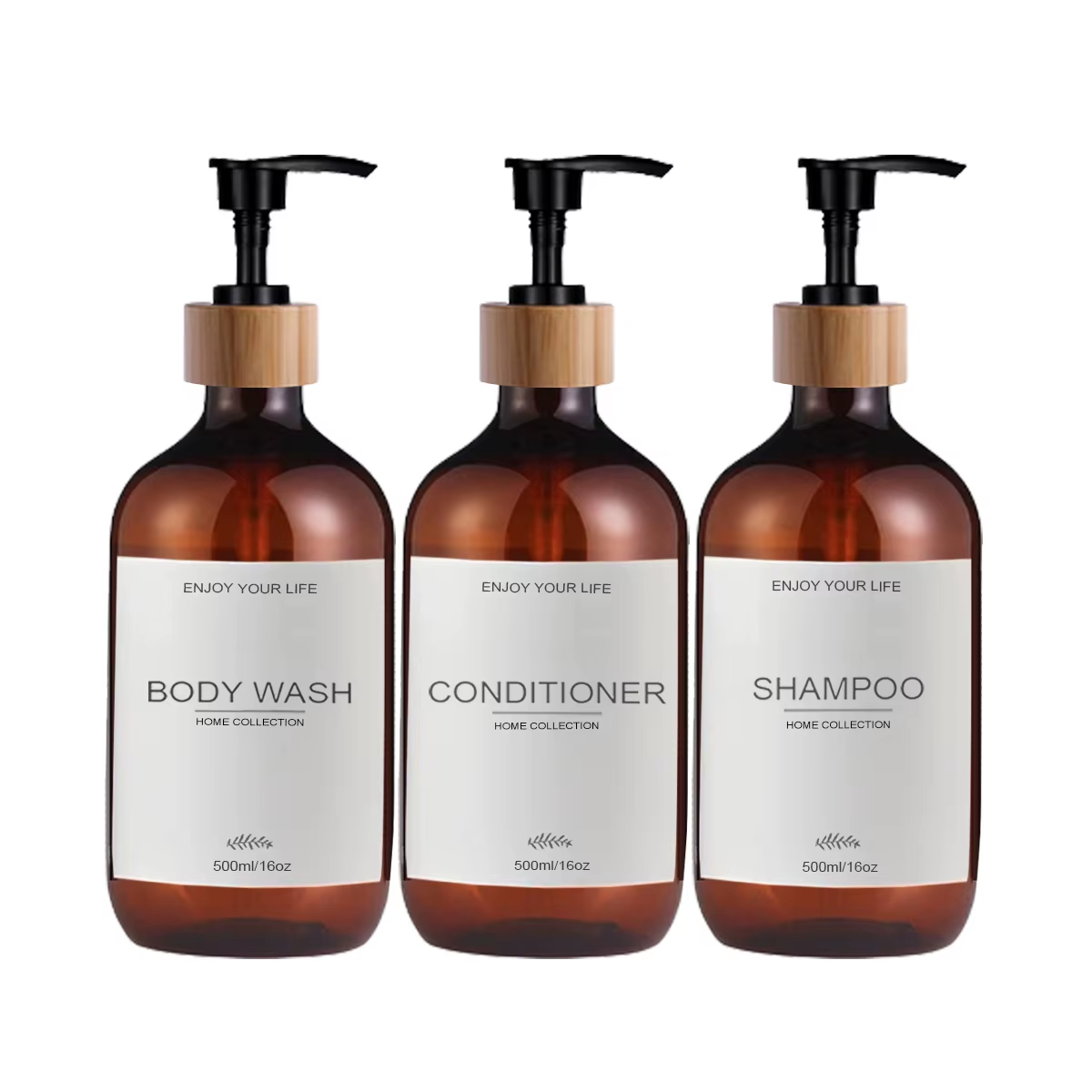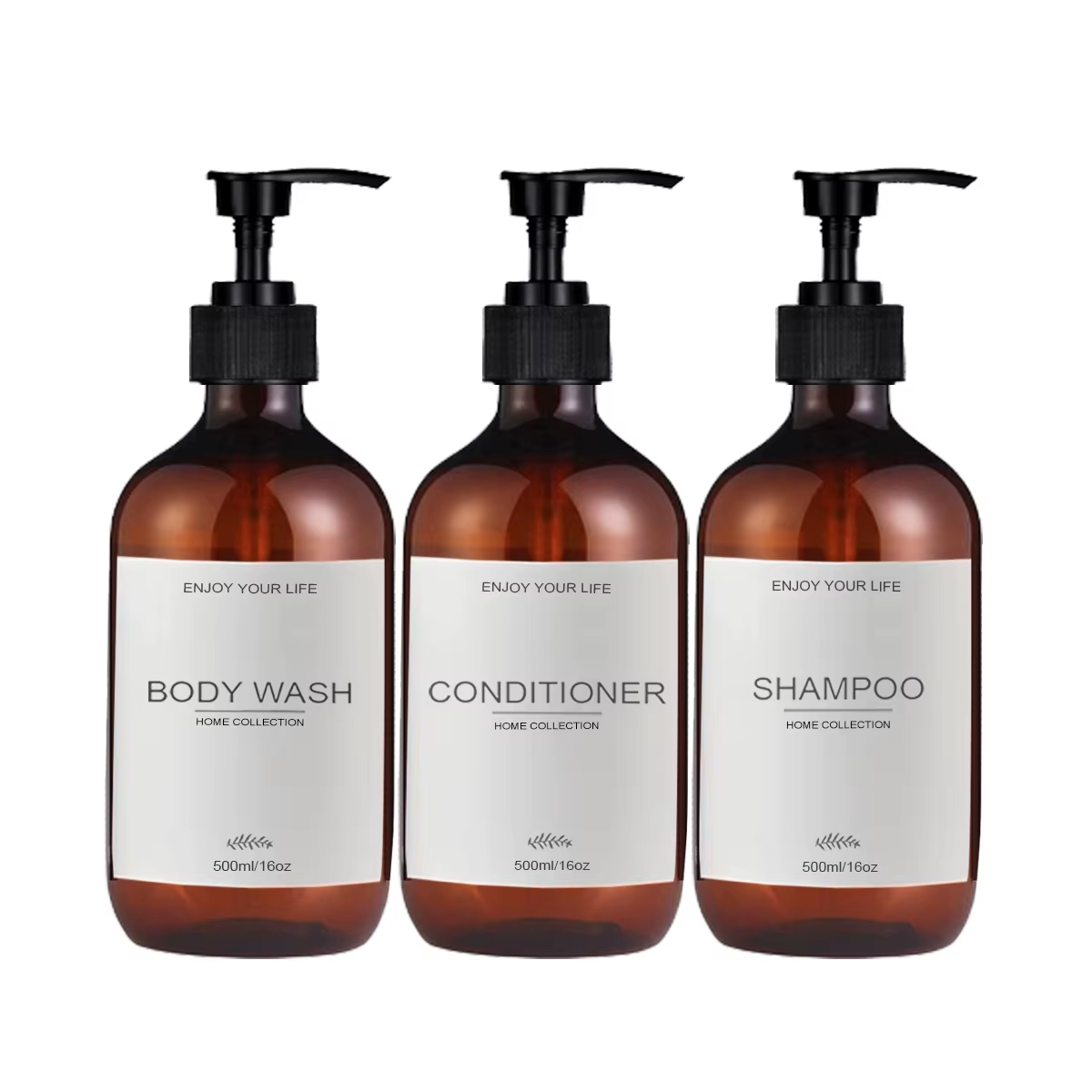 MaisoNovo Refillable Shampoo and Conditioner Bottles - Set of 3, 500ml Amber Plastic Bottle and Black Pump - Shampoo and Conditioner Bottles with