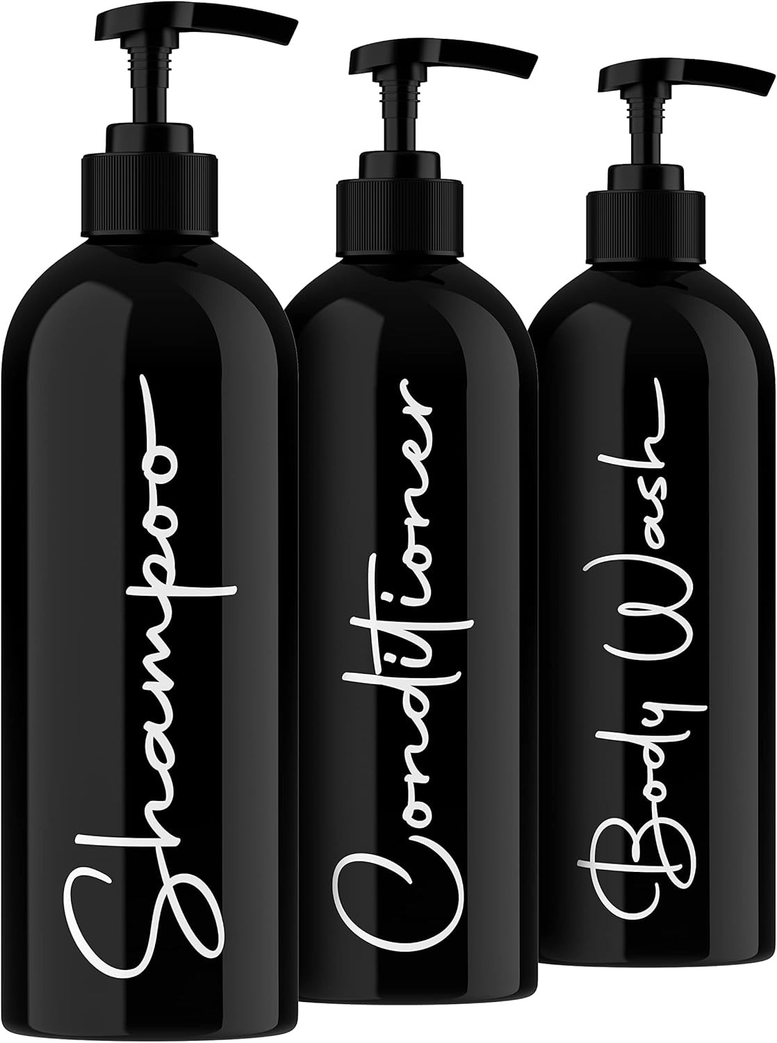 Alora Home Essentials Reusable Shampoo and Conditioner Bottles - Set of 3 Matte Black Permanent Stylish Labels 16oz Pump Bottle Dispenser, Body Wash Plastic Refillable (MBBW16)