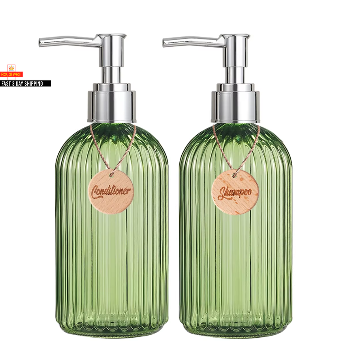 OLLIES Shampoo and Conditioner Dispenser, Shower Soap Dispenser for Bathroom-Set of 3 with Permanent Stylish Label-17oz, 500ml Refillable Shampoo and Conditioner Bottles Green