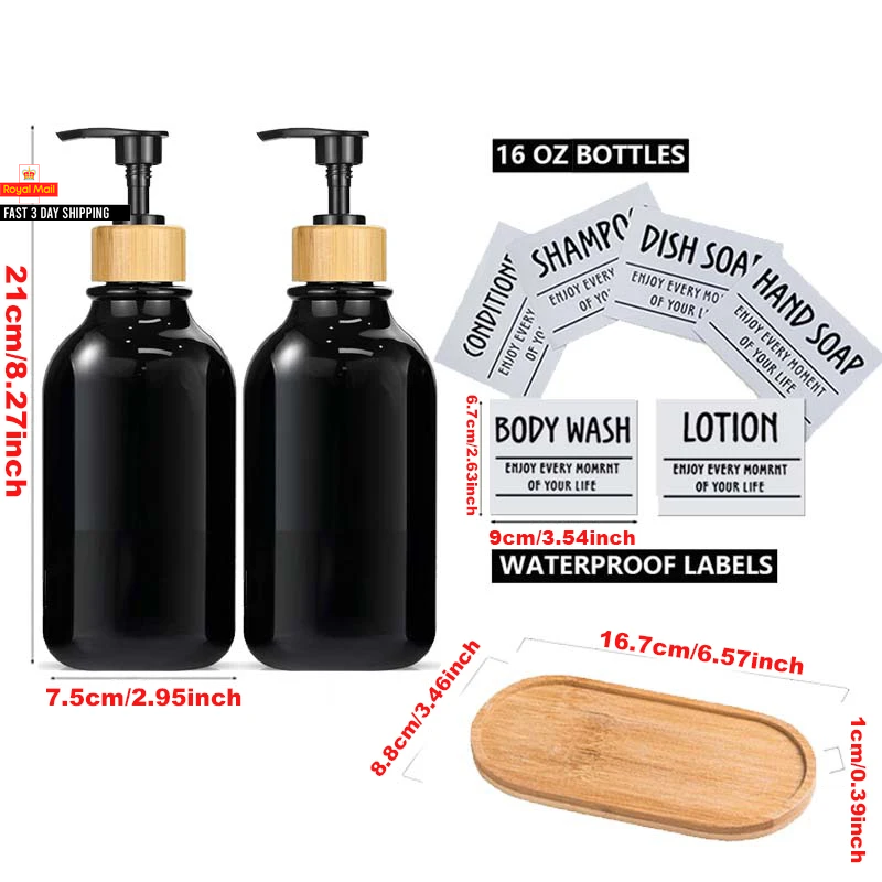 Shampoo and Conditioner Bottles, Apothecary Dispenser Bamboo Pump, Refillable Shampoo Bottles for Shampoo Lotion Oil Shower Soap Hand Soap and Dish Soap, Plastic Black Set (Black)