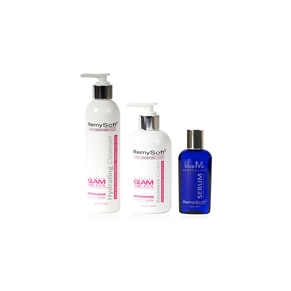 RemySoft Glam Rocker System - Safe for Hair Extensions Weaves and Wigs - Salon Formula Shampoo Conditioner & Serum - Gentle Sulfate-free Lather