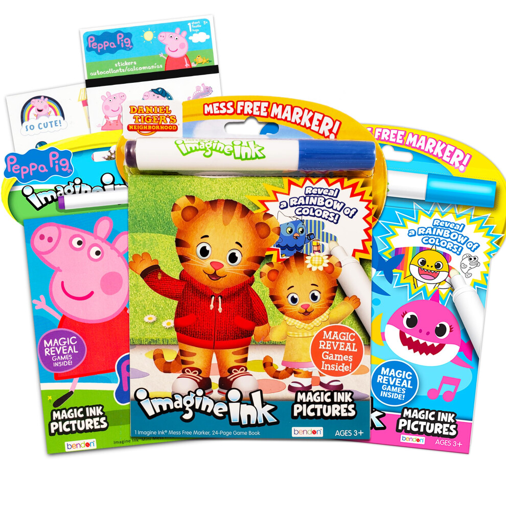 Imagine Ink Coloring Book Bundle ~ 3 Pack No Mess Magic Ink Activity Books with Daniel Tiger Peppa Pig and Baby Shark with Peppa Pig Stickers