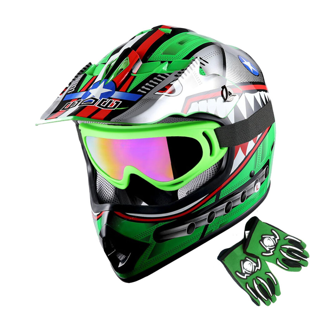 WOW Youth Motorcycle Full Face Helmet Street Bike BMX MX Kids Shark Green + MX Skeleton Glove Bundle