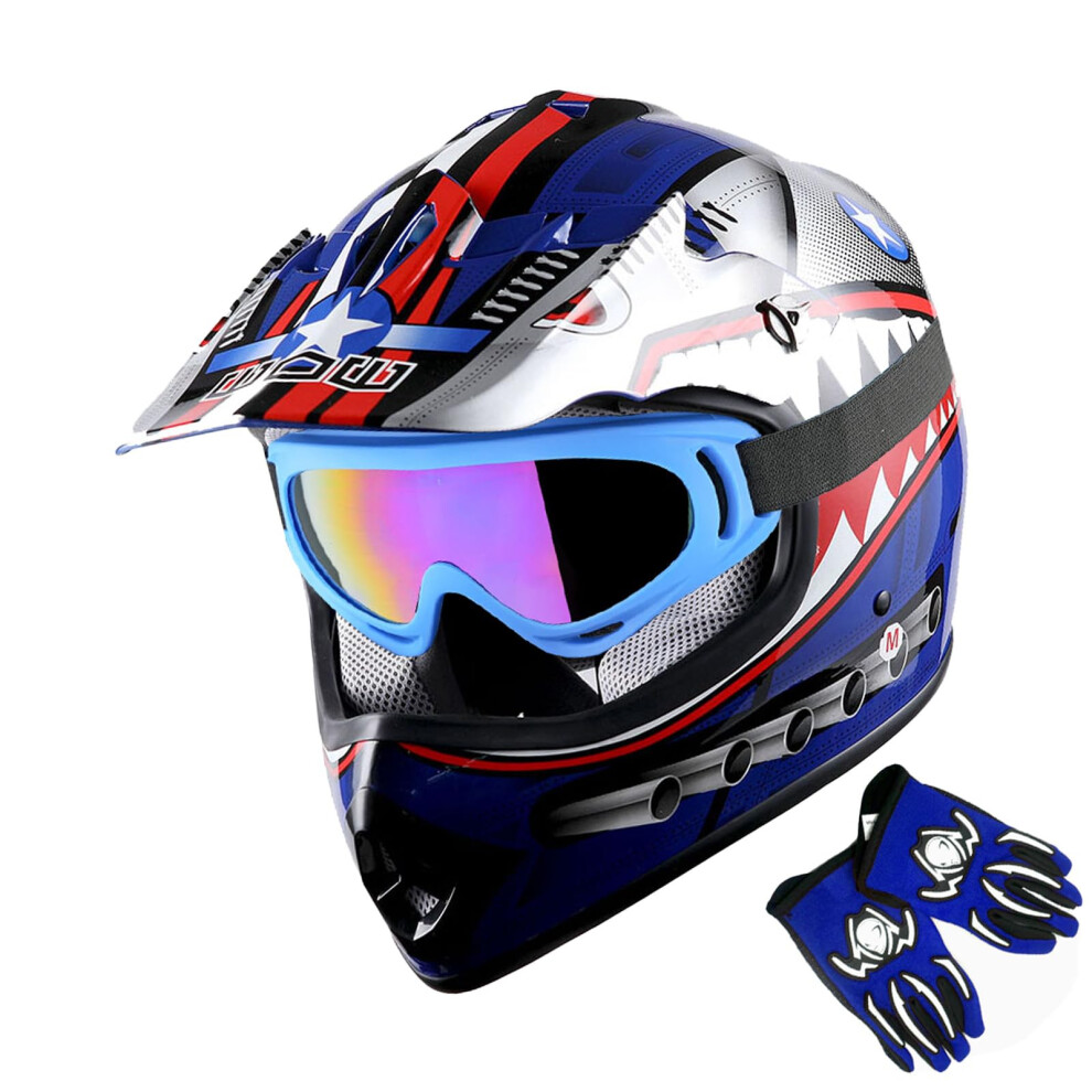 WOW Youth Motorcycle Full Face Helmet Street Bike BMX MX Kids Shark Blue + MX Skeleton Glove Bundle