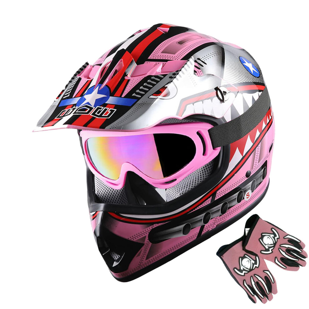 1Storm Youth Motocross Helmet Kids Motorcycle Bike Helmet Shark Pink Goggles MG Youth Pink Glove Bundle