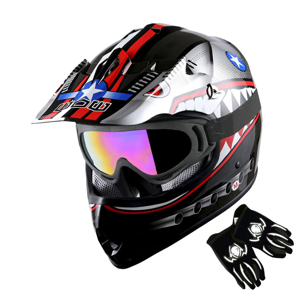 WOW Youth Motorcycle Full Face Helmet Street Bike BMX MX Kids Shark Black + MX Skeleton Glove Bundle Size Medium