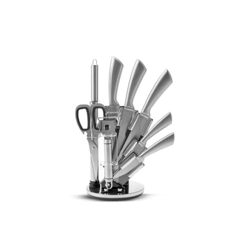 Karaca Meister Palm German Stainless Steel Knife Set with Stand, Ultra Sharp Stainless Steel Kitchen Knives with 360 Degree Rotating Stand, Premium Quality Professional Knife Set, 8 Piece, Silver