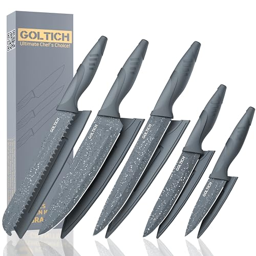 GOLTICH 5 PCs Grey Kitchen Knife Sets with Sheath - Premium Stainless Steel Kitchen Knives Set with Easy Grip Handle - Ultra Sharp Knife Set Includes Santuko, Bread, Paring, Utility & Chef Knife