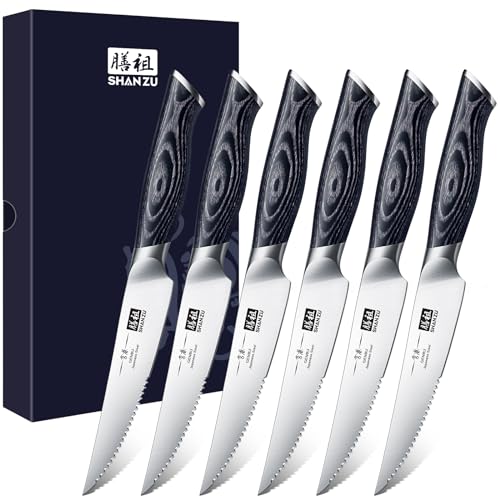 SHAN ZU 6 PCS Steak Knife Set, 4.5 Inch High Carbon Japanese Super Steel Steak Knives Set, Ultra Sharp Kitchen Steak Knife with K133 Ergonomic Handle- Genbu Series