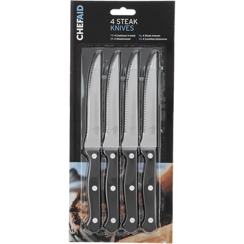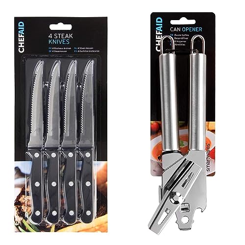 Chef Aid Stainless Steel Serrated Steak Knife Set, 4 Durable Multipurpose Kitchen Knives with Comfort Grip, Ergonomic - Non-Slip, Rust Resistant, Sharp Dinner Table Knife Set Can Opener
