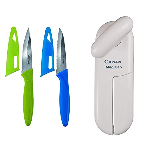 CULINARE C33005 2 Piece Knife Set | Green/Blue | Stainless Steel | 9cm Ultra Sharp Blades & C10015 MagiCan Tin Opener | White | Plastic/Stainless Steel | Manual Can Opener