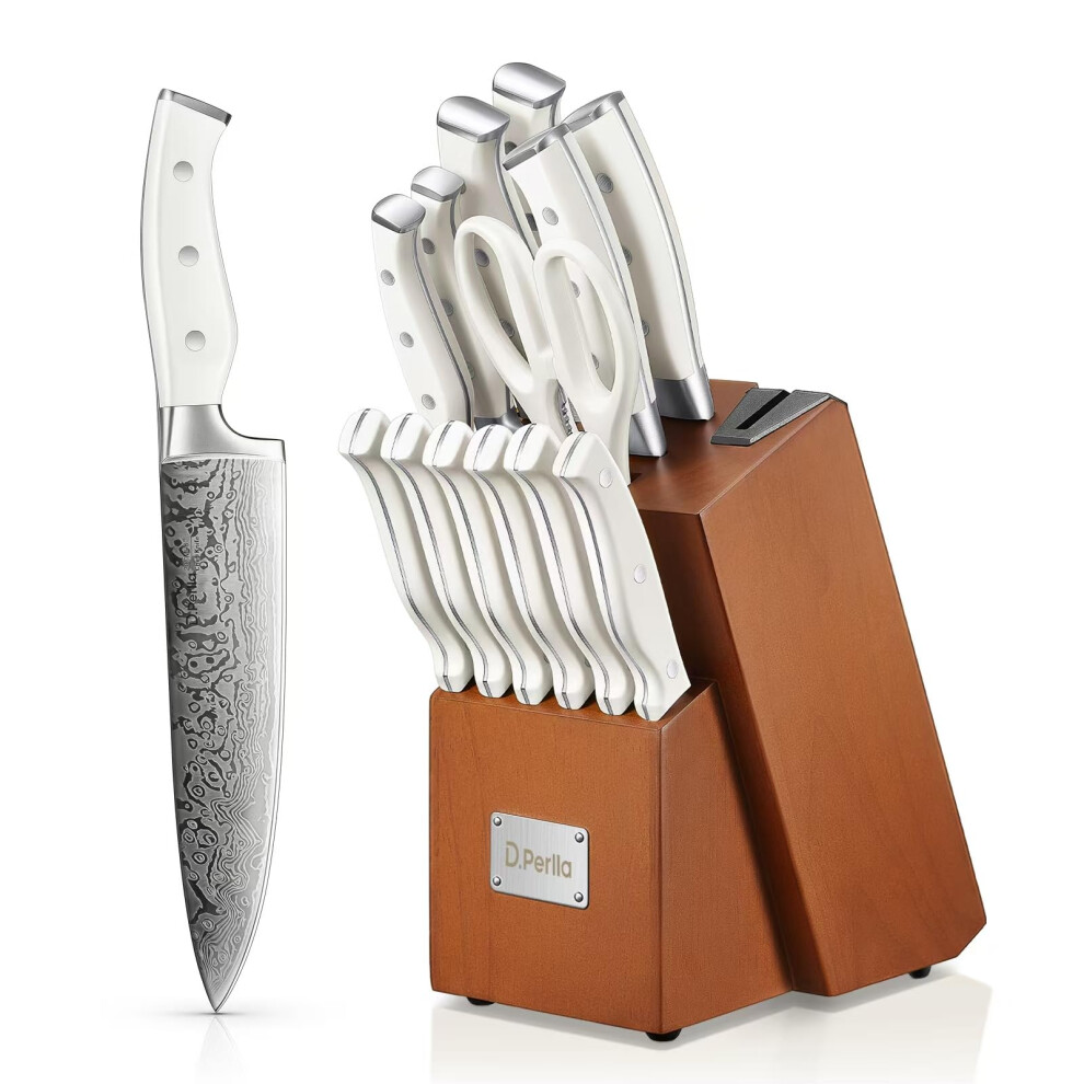 D.Perlla Knife Set with Block, 14 Pieces Knife Set with Sharpener, Stainless Steel & Sharp Kitchen Knife Set, Triple Riveted Ergonomic Handle, Brown
