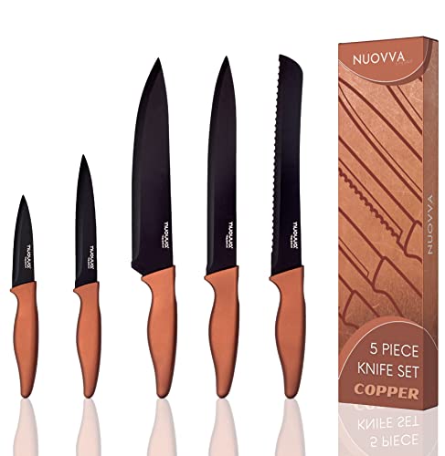 nuovva Sharp Kitchen Knife Set – 5pcs Copper Kitchen Knives – Professional Stainless Steel Filleting Knives - Black Non Stick Blades
