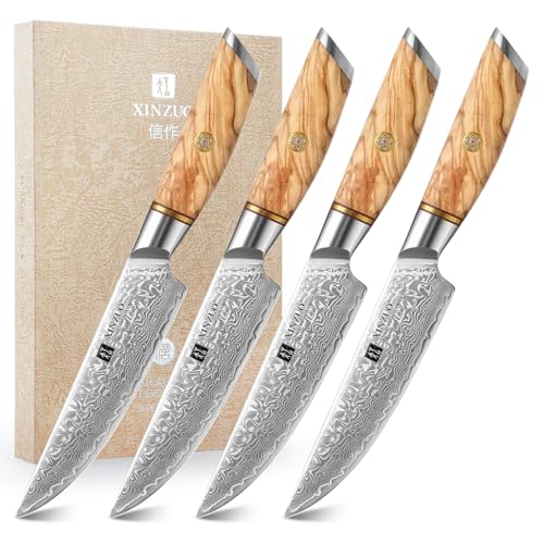 XINZUO Damascus Steak Knife Set of 4 with Olive Wood Handle, Not Serrated Steak Knives,73 Layers Damascus Japanese Knives, Ultra Sharp Damascus Table Knife Set