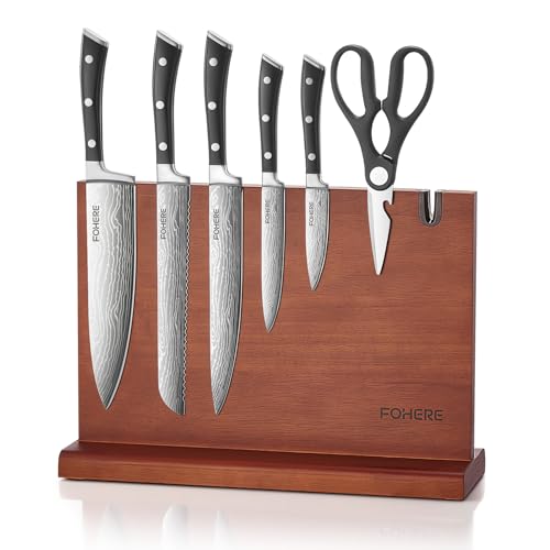 FOHERE Kitchen Knife Set with Magnetic Knife Holder and Sharpener, 7 Pieces Ultra Sharp Chef Knife Set with Ergonomic Handle, Waved Pattern High Carbon Stainless Steel Knives Set for Kitchen