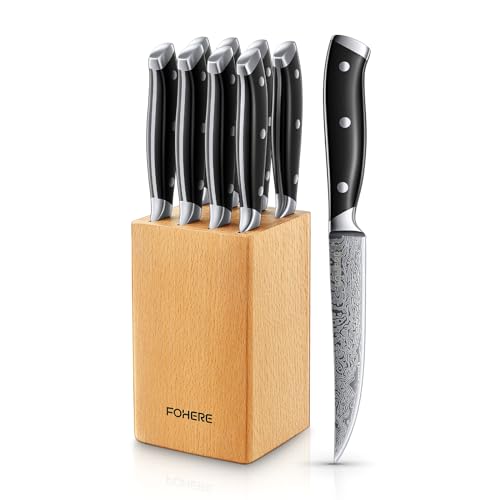 Steak Knives Set of 8 with Block FOHERE 4.5 Inch High Carbon Stainless Steel Kitchen Knife Set Non-Serrated Knife Set with Damascus Pattern, Full Tang Handle Design Super Sharp Dinner Knives