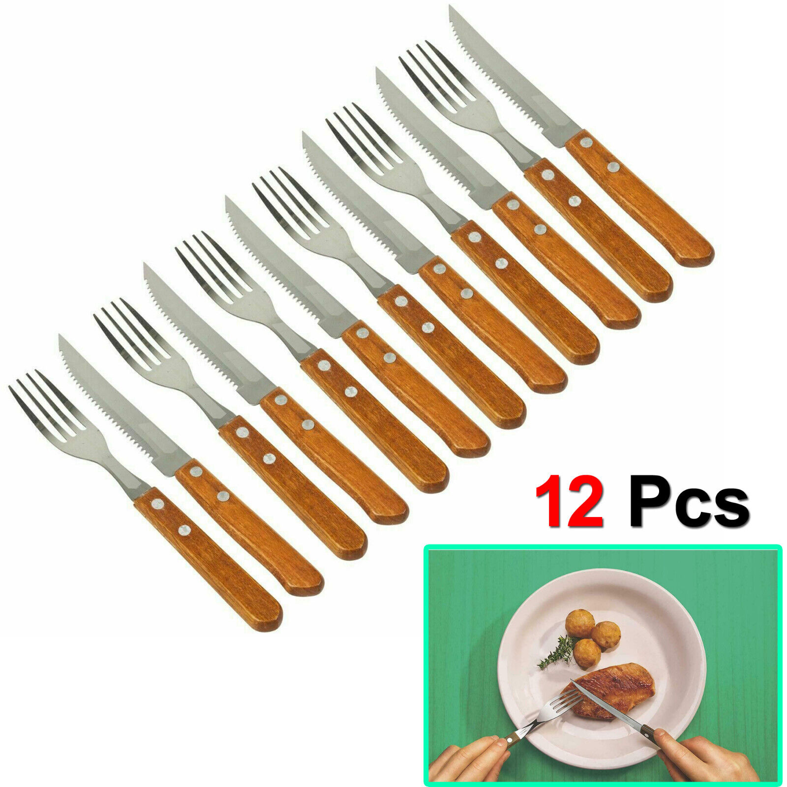 12pc Stainless Steel Steak Knives & Forks 6 Sets Wooden Sharp Knife Cutlery Set