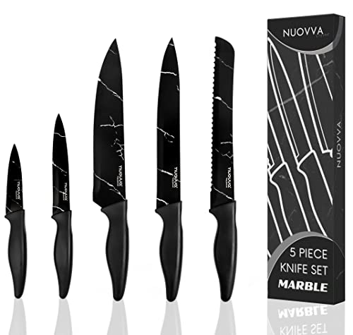 nuovva 5pcs Kitchen Knife Set – Ultra Sharp Kitchen Knives – Premium Stainless Steel Blades – Chef, Bread, Santoku, Paring and Utility Knives