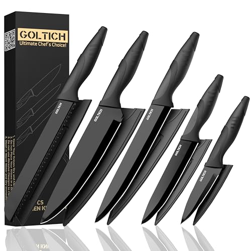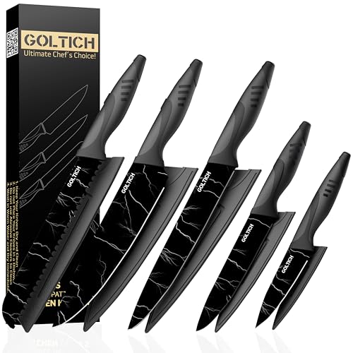 GOLTICH 5 PCs Black Kitchen Knife Sets with Sheath - Premium Stainless Steel Kitchen Knives Set with Easy Grip Handle - Ultra Sharp Knife Set Includes Santuko, Bread, Paring, Utility & Chef Knife