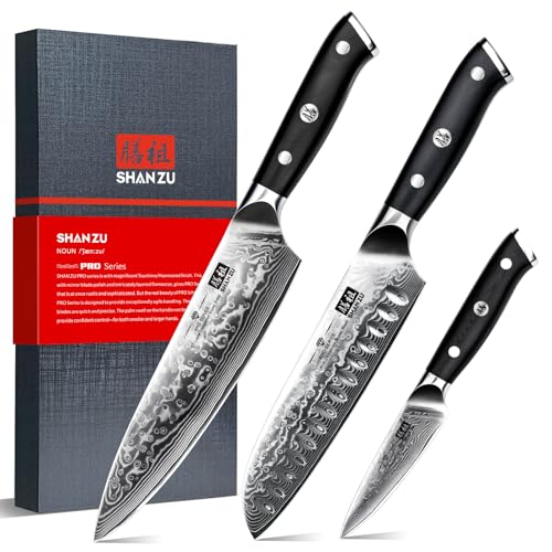 SHAN ZU Damascus Knife Set of 3 PCS, Japanese Damascus Steel 67 Layers Kitchen Knives Set High Carbon Professional Ultra-Sharp Chef Knife Set Ultra Sharp Cooking Utility Knife Set with G10 Handle