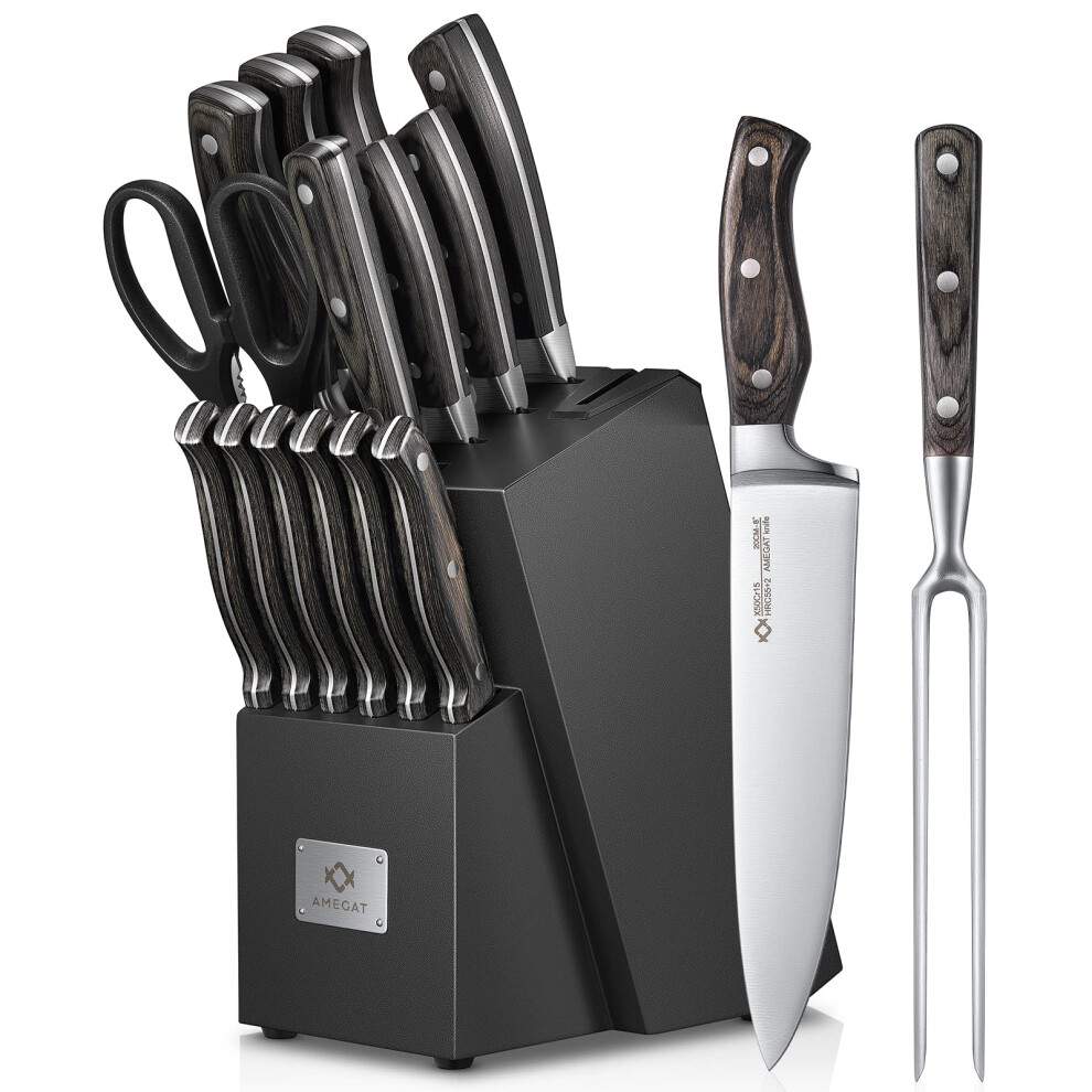 AMEGAT 15-Piece Knife Set with Built-in Sharpener and Carving Fork, Ultra Sharp Knife Block Set with Full Tang Design & Wooden Handle, High Carbon