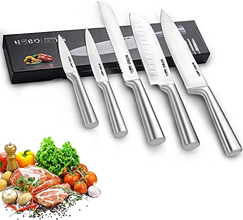 HOBO Knife Set, Professional 5-Piece Stainless Steel Kitchen Knife Set, Non-Slip Frosted Handle, Serrated and Standard Sharp Chef Knife, Bread Knife for Mincing, Chopping, Slicing.