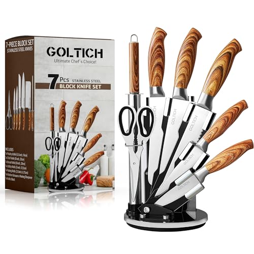 GOLTICH 7 PCs Kitchen Knife Set with Block and Sharpener - Ultra Sharp Stainless Steel Kitchen Knives with Acrylic 360 Degree Rotating Stand - Premium Quality Professional Knife Block Set with Knives