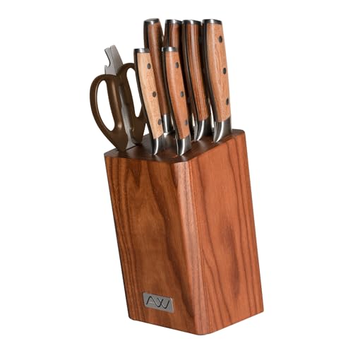 Rockingham Forge Ashwood 8 Piece Wooden Kitchen Knife Block Set with Sharpener & Scissors – Professional Ultra Sharp German Stainless Steel Blades - Durable Full Tang Natural Wood Handle