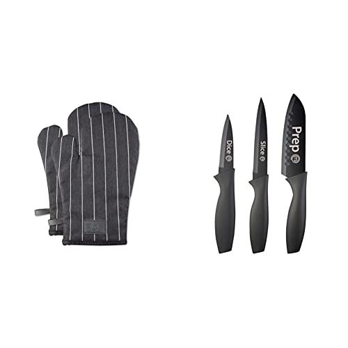 MasterChef Oven Mitts Pair of 2 Heat Resistant Gloves, 100% Cotton, Black, One Size Fits All With Vegan PU Leather Logo & Hanging Loop, Machine Washable & Knife Set of 3 Kitchen Knives, Extra Sharp