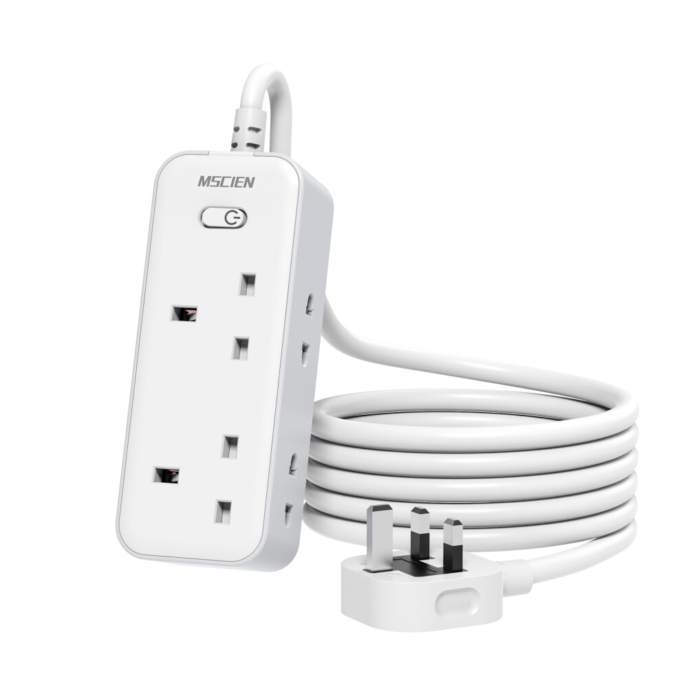 2M Extension Lead with 3 USB Slots, Mscien Shaver Plug Adaptor UK 2 Way with 13A Fuse, Extension Cable 2 Metre with Wall Mountable, Power Strip for E