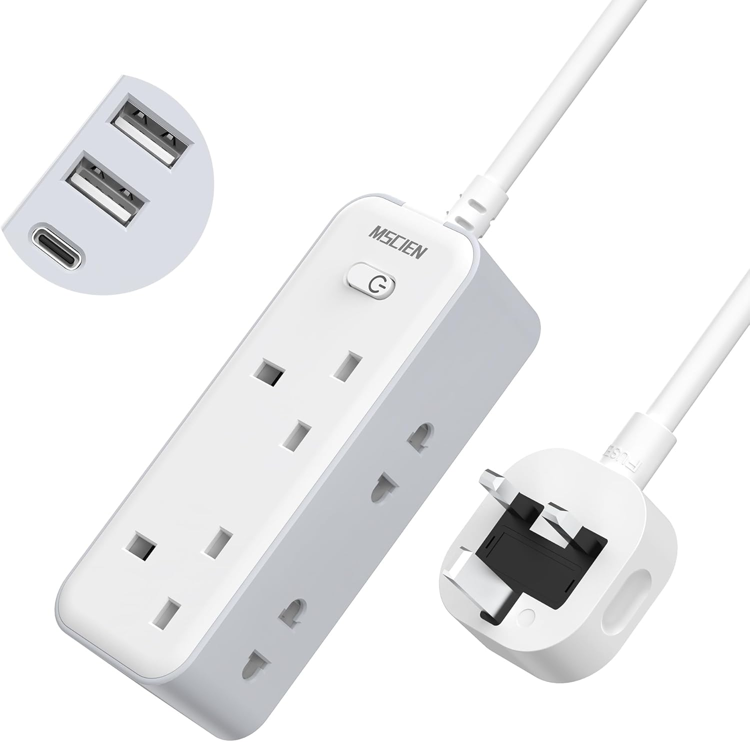 3M Extension Lead with 3 USB Slots, Mscien Shaver Plug Adaptor UK with 13A Fuse, 2 Way Extension Cable, Extension Cord 3 Metre with Wall Mountable for