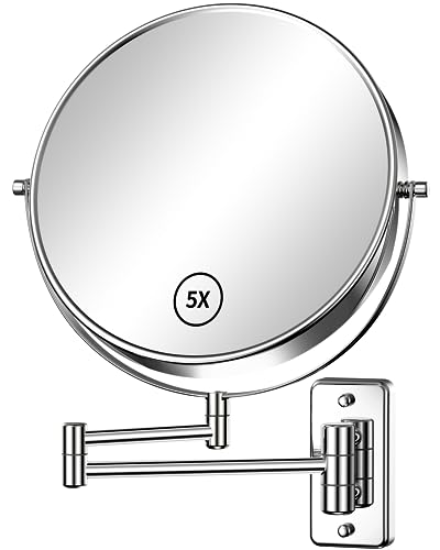 HIMRY Wall Mounted Mirror 8 Inch 5x Magnification, 2-Sided Shaving Mirror Make Up Mirror, Without Drilling (Power LOC) or With drilling, Foldable Bathroom Wall Mirror, Chrome finish, KXD3107-5x