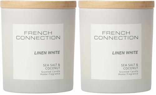 French Connection Pastel Range Scented Container Candle | Shea Butter Wax | Frosted Glass Jar Bamboo Lid | Round Shape | (Medium, Linen White) (Pack of 2)