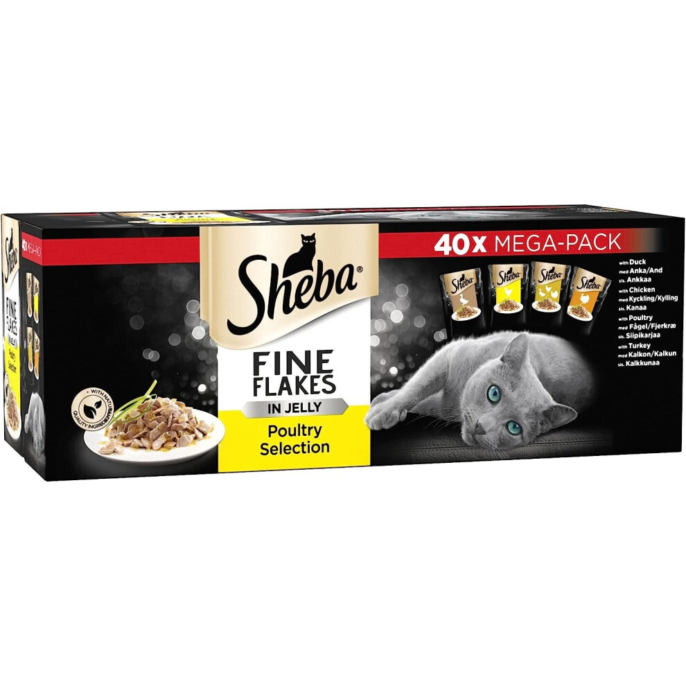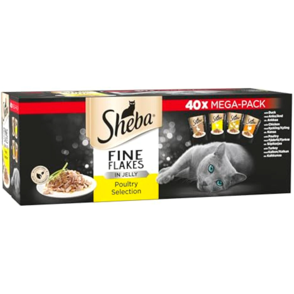Sheba Fine Flakes Poultry Collection in Jelly 40 Pouches, Adult Wet Cat Food, Megapack (40 x 85 g)