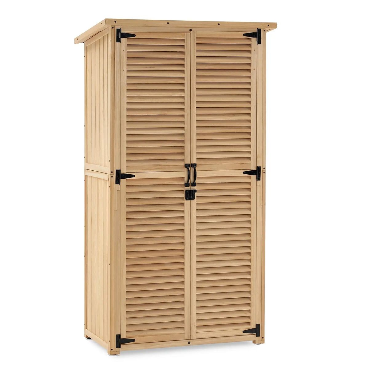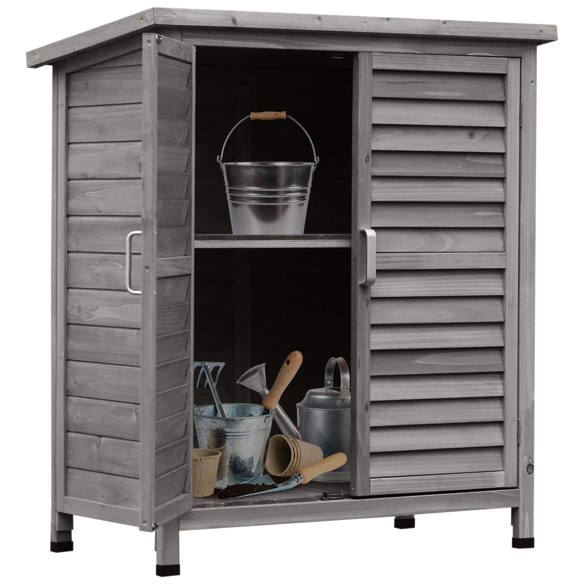 BSKJMMP Storage Shed Garden Shed Wood Outdoor Organizer with Floor Tool Rack Cabinet with Shelves and Wooden Doors for Patio Furniture Cushions Pool Toys