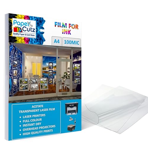 Papercutz A4 Laser Acetate Sheets (50 Sheets), 100 Micron Acetate Sheets A4, Transparent Paper for Printing, Overhead Projector Film, OHP Sheet, Clear Plastic Sheeting for Crafting