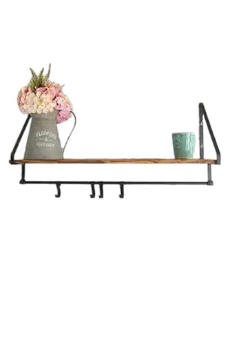 Four Seasons Liverpool Wall Shelf and Hooks - Black Metal and Oak Coloured Wood Shelf Industrial Style Kitchen Butchers Hooks