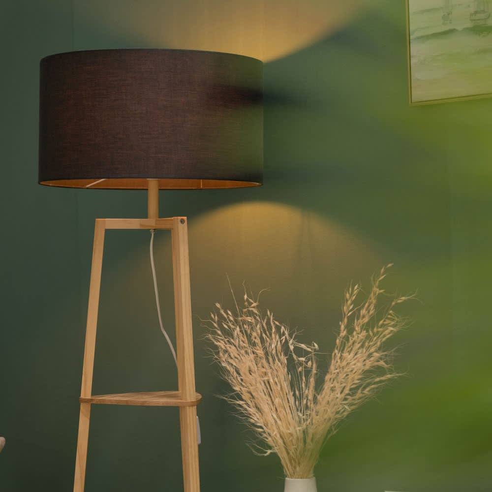 ValueLights Hiru Natural 3 Tier Wooden Shelf Floor Lamp with Large Drum Shade in Charcoal