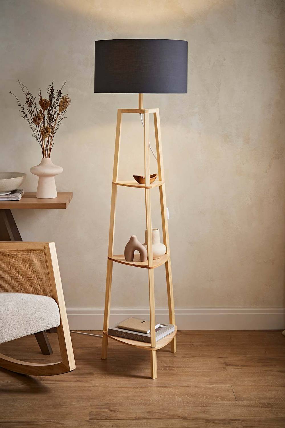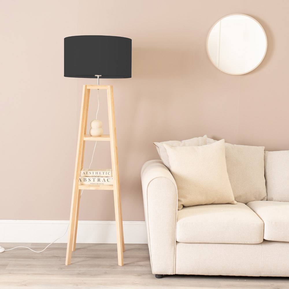 Hiru Grey 3 Tier Wooden Shelf Floor Lamp With Large Black Shade