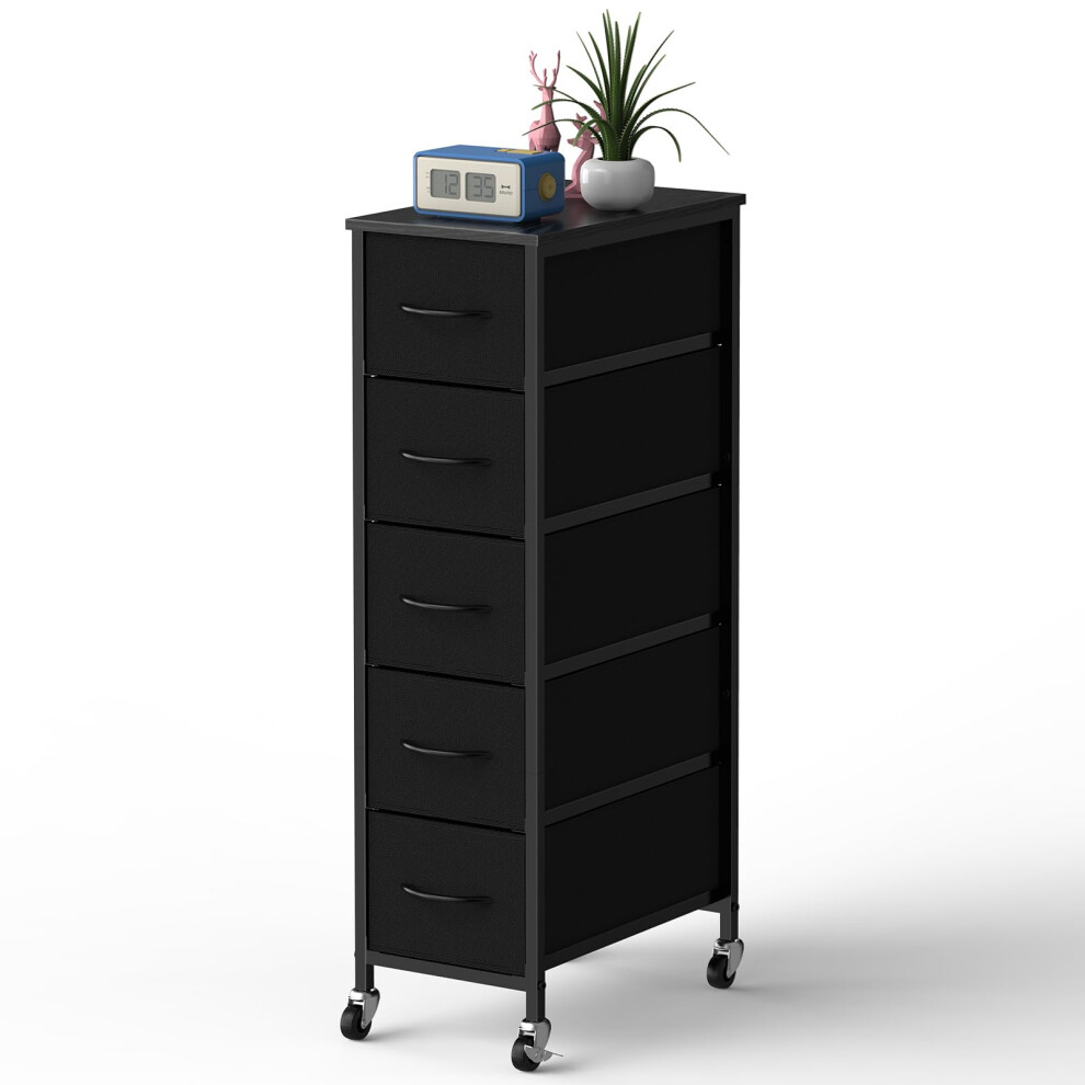 LIANTRAL Narrow Dresser with 5 Drawers, Storage Cabinet, Slim Fabric Tower with Wheels, Wood Top Shelf, Bedroom Chest of Drawers for Small Spaces, Bathroom, Living Room, Laundry, Closet, Black
