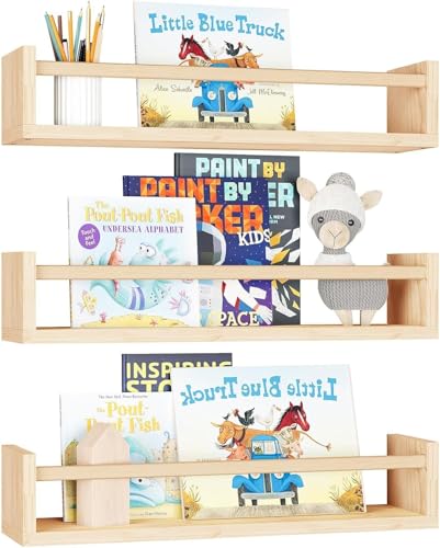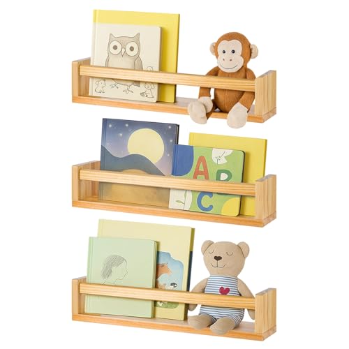 Nursery Book Shelves, 16.5 Inch Floating Book Shelves for Wall Set of 3, Baby Nursery Decor, Solid Wood Wall Mounted Shelves for Children's Room, Bedroom,Bathroom,Kitchen,and More (Natural Wood)