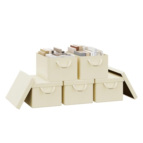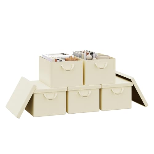 WOLTU Storage Boxes Set of 5, Storage Baskets, Storage Cubes with Handles and Lid, Fabric Folding Baskets for Shelves in Bedroom, Study, Children's Room, with Metal Frame, Cream,48x20x29 cm