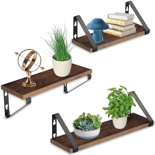 tectake® Set of 3 Wall Shelves in Minimalist Design, Floating Shelves in Different Sizes with Wooden Look & Sturdy Steel Brackets, Shelf Set for Living Room, Bedroom, Kitchen, Bathroom - Dark Wood